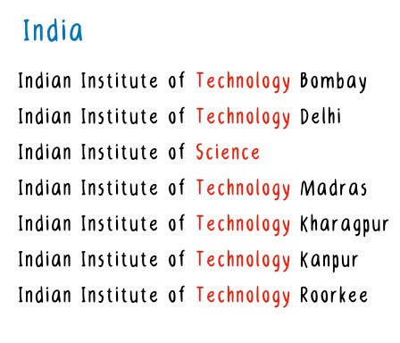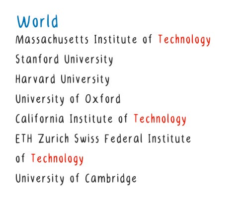 Take a look at the top 7 universities in the world, and top 7 universities in India according to QS World University Ranking, counting the number of times technology or science is used.